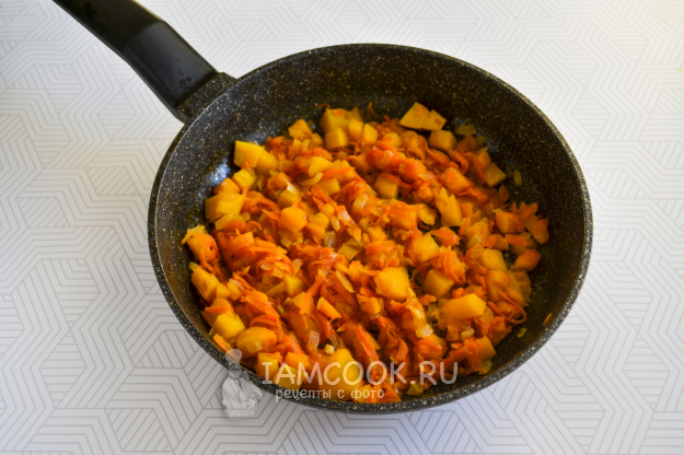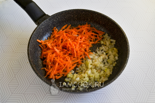 Помешивая, обжарьте лук до золотистого цвета. Добавьте натертую на крупной терке морковь. Перемешайте, жарьте на среднем огне 4-5 минут.