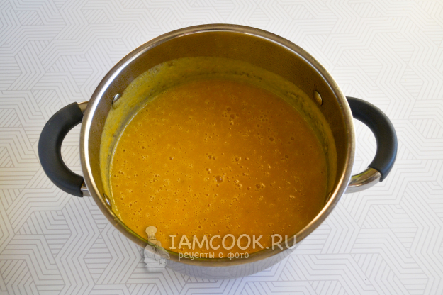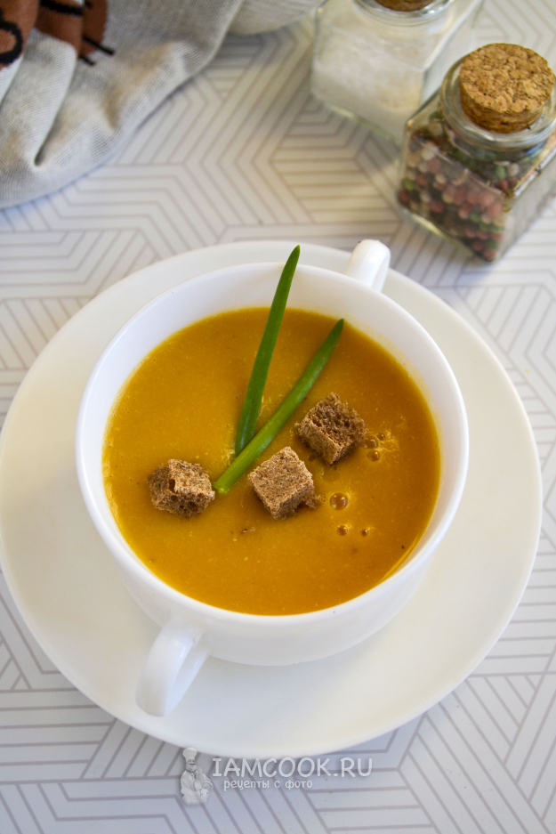 Погружным блендером пюрируйте содержимое кастрюли до однородной массы. Постный суп-пюре из тыквы с чечевицей готов.