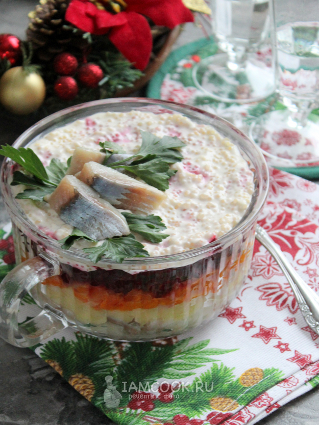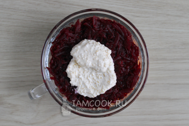 Последний слой - свекольный, и его укройте майонезно-икорной заправкой.