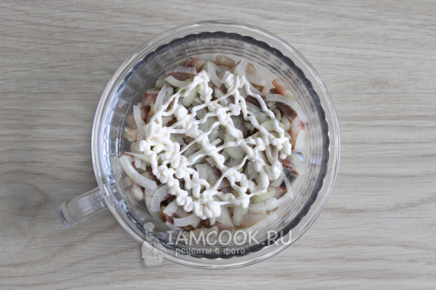Первый слой - нарезанное на кусочки филе сельди. Укройте его нашинкованным репчатым луком, смажьте майонезом.