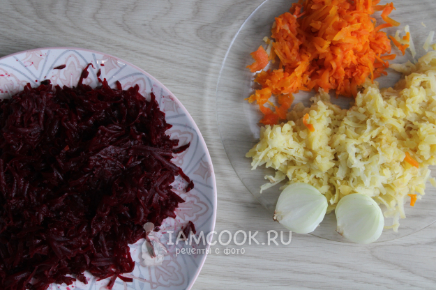 Эти остывшие и очищенные овощи нужно натереть на крупной тёрке по отдельности. Сначала картофель, потом морковь, и последней - свёклу, тогда тёрку можно не мыть после каждого овоща.