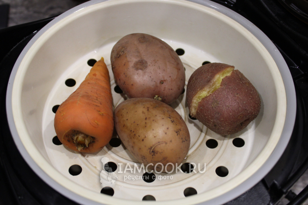 Заранее сварите свёклу, картофель, морковь или купите готовые... Свёкла у меня обычно покупная готовая в вакуумной упаковке. А картошка и морковь у меня свои, так варю на пару в мультиварке. Для среднего размера получается в течение 25-30 минут. Проверка была протыканием ножа, что и видно на фото - лопнуло))
