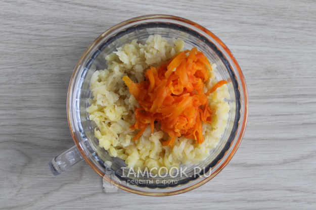 Затем тёртый картофель, на него - морковь, предлагаю сопроводить сеточкой из майонеза.