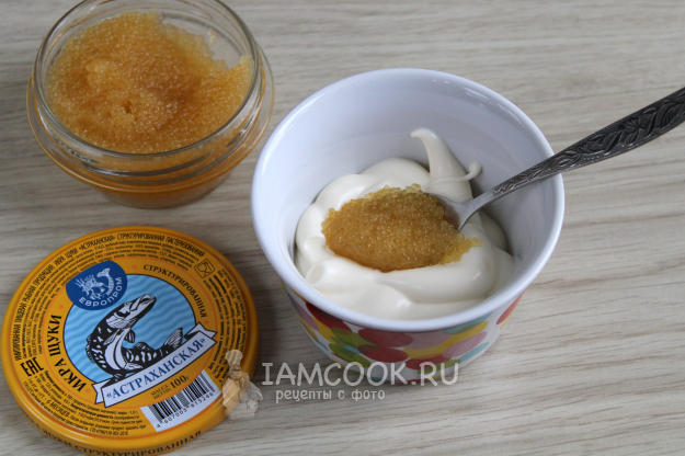 Для заправки соедините и перемешайте весь или около половины майонеза с щучьей икрой, натуральной или структурированной. Можно ещё и сметану вмешать.