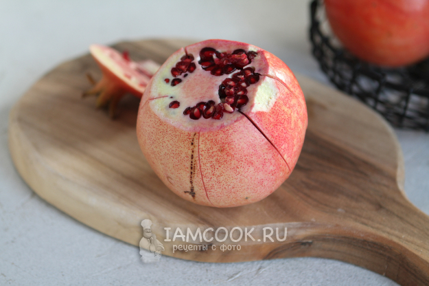 В зависимости от плотности плода можно сделать разное количество надрезов. У меня гранат лопнул на глазах уже после третьего надреза. Посмотрите, как красиво он раскрылся.