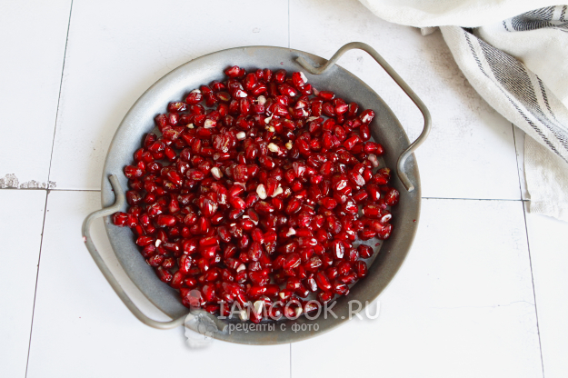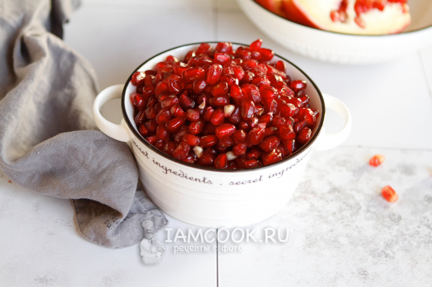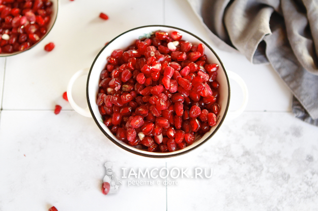 Далее уже дело техники. Можно половинки граната перевернуть над тарелкой и постучать по кожуре ложкой. Кто-то опускает гранат в миску с водой и так освобождает его от зернышек. Я чищу гранат руками. Если вы остерегаетесь испачкать пальцы соком, то можно надеть перчатки. Но я настолько уже приноровилась, что один гранат с легкостью могу почистить за пару минут.