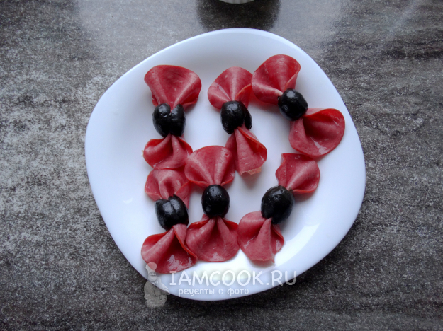 Маслины разрезать с одной стороны. Колбасу свернуть в виде гармошки и скрепить по центру маслиной.