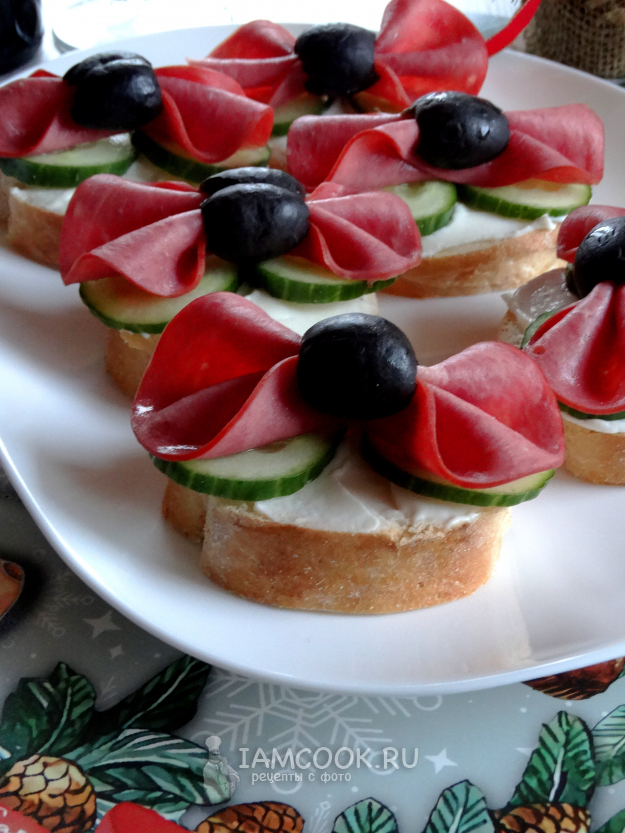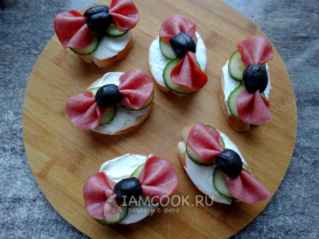 Выложить на каждый бутерброд "бантик" из колбасы.