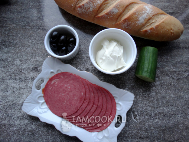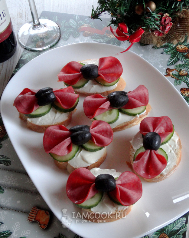 Чтобы приготовить бутерброды-бантики, надо взять колбасу или ветчину, нарезанную тонкими слайсами.