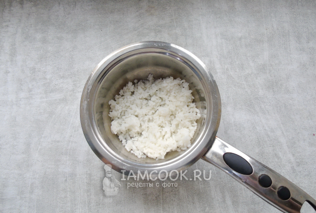 Тем временем отварите рис. Крупу помойте и выложите в кастрюлю. Залейте водой в соотношении объема риса к воде 1:2 и посолите по вкусу. Варите до готовности. После откиньте рис на дуршлаг.