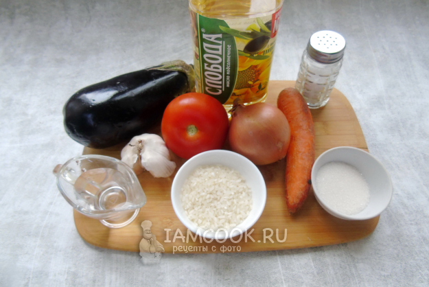 Соберите ингредиенты для приготовления салата с баклажанами и рисом на зиму.