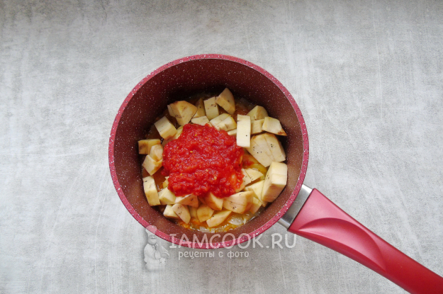 Баклажаны очистите и помойте. Нарежьте кубиками и выложите в кастрюлю к остальным овощам.