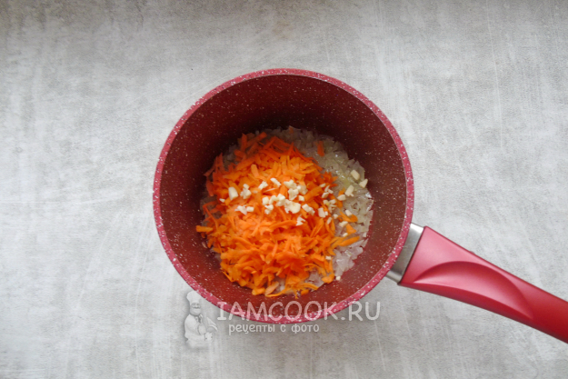 Морковь и чеснок очистите, помойте. Морковь натрите на терке, а чеснок мелко нарежьте. Добавьте в кастрюлю с луком. Тушите на огне ниже среднего 7-8 минут.