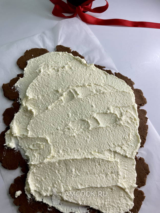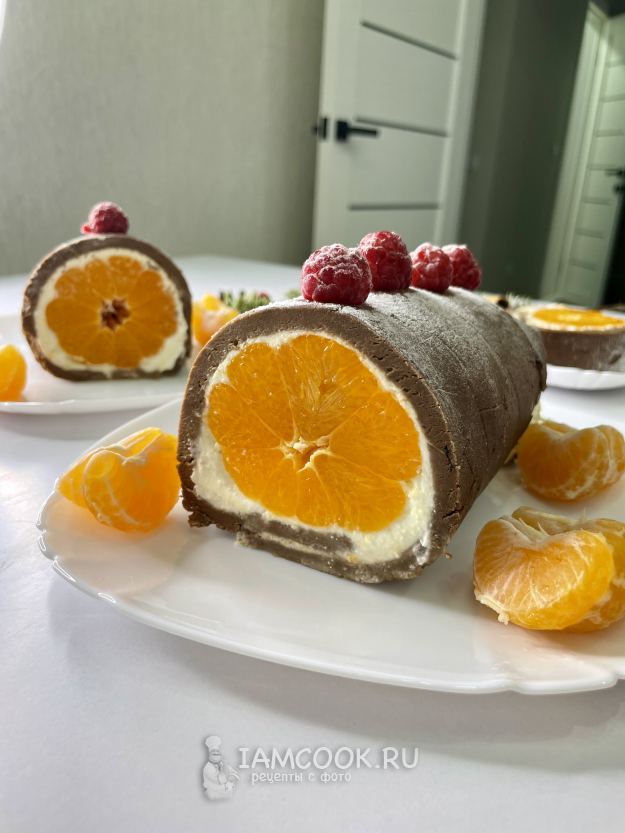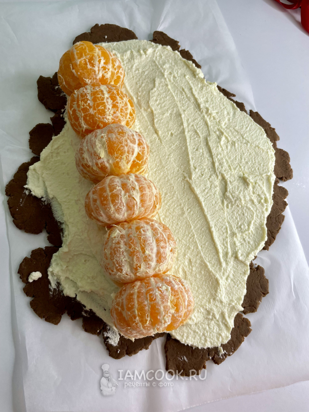 Выкладываем мандарины и начинаем закручивать рулет. Рулет ставим в холодильник на 10-15 минут.