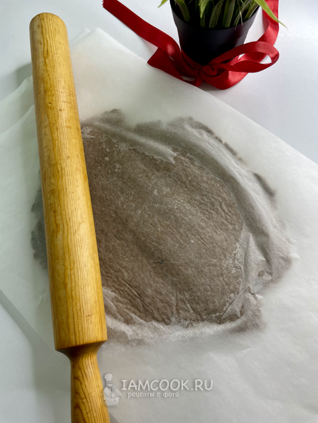 На лист пергаментной бумаги выкладываем печенье. Сверху кладем второй лист пергаментной бумаги и раскатываем скалкой.
