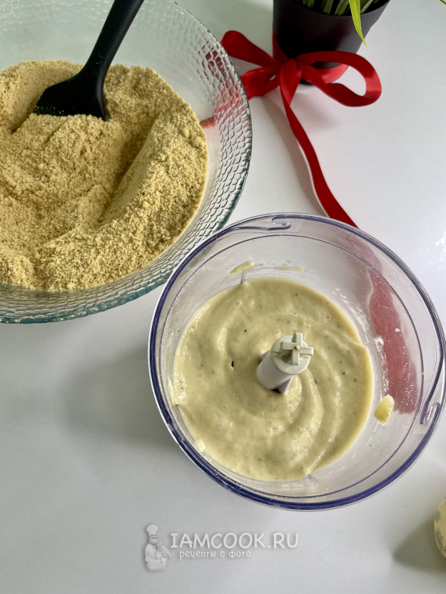 Печенье измельчаем в блендере и перекладываем в чашу. Бананы также измельчаем в блендере до состояния каши.