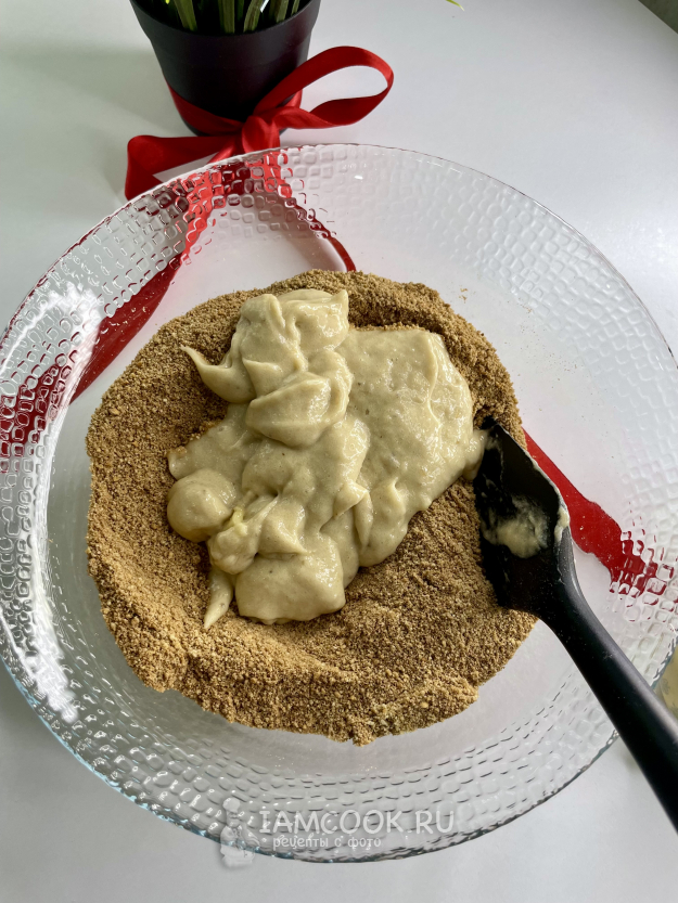 В чашу с печеньем кладем какао и банановое пюре. Хорошенько перемешиваем.