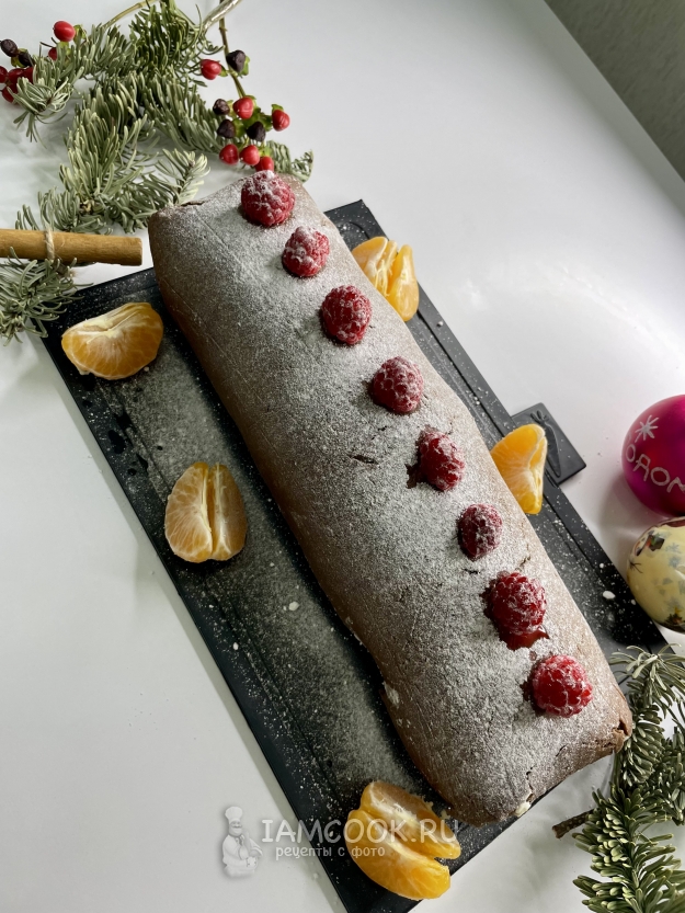 Достаем рулет из холодильника и украшаем малиной. По желанию можно посыпать сахарной пудрой.