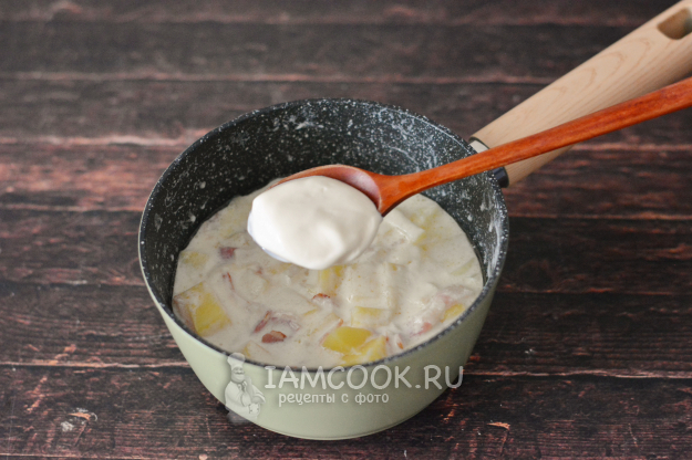 Когда картофель станет мягким, снимите кастрюлю с огня и добавьте в суп плавленый сыр, размешайте, чтобы сыр растворился.