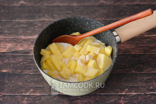Затем добавьте в кастрюлю нарезанный кубиками картофель, нарубленный крупно зубчик чеснока и влейте примерно 200 мл молока.