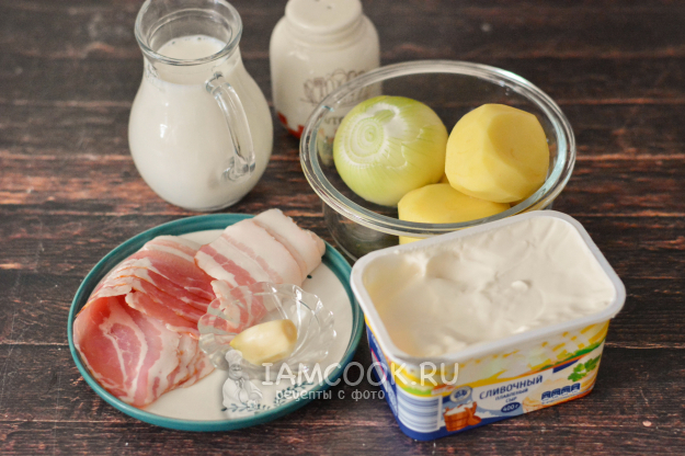 Для приготовления сырного крем-супа с беконом соберите все необходимые продукты по списку.