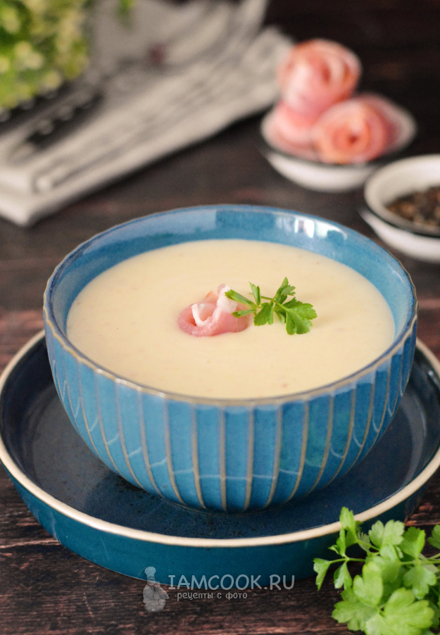 Сырный суп-пюре с беконом готов, он получается шелковистым, нежным, тягучим.