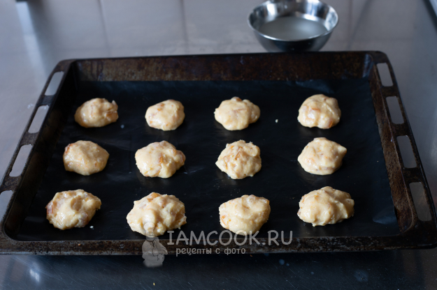 Смоченными в воде руками (или двумя столовыми ложками) формируем печенье и выкладываем на противень поверх кондитерской бумаги с большими зазорами между печеньками. Потому что это тесто, даже более плотное, чем у меня, всё равно будет расплываться.