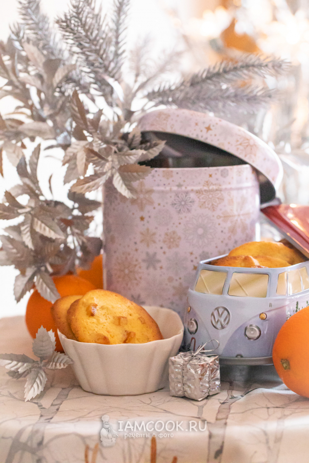 Сразу после того, как печенье с апельсиновыми цукатами остынет, его рационально поместить в плотную банку под крышку. Видите на фотографии вертикальную жестяную банку на заднем плане? А для масштаба - апельсины и игрушка-"подарок". Так вот, в ту банку как раз влезает всё печенье из такого количества ингредиентов, за исключением той печенины, которую я уже "запробовала".