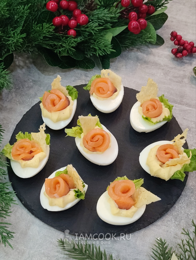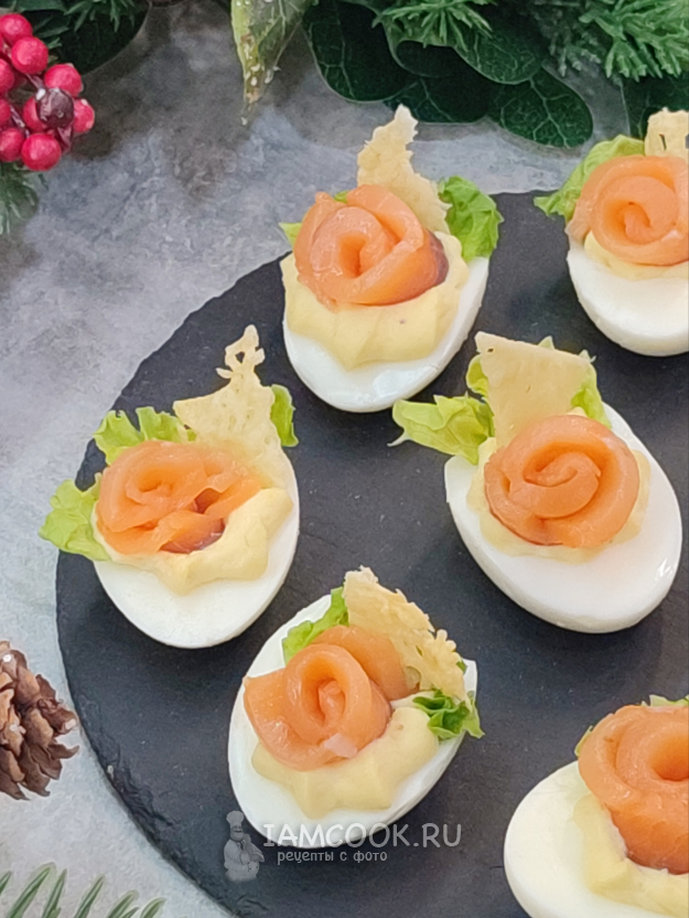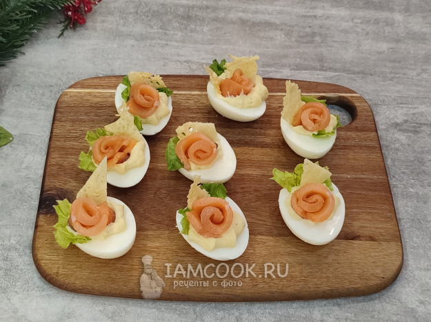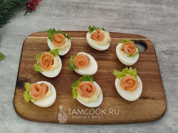 Фаршированные яйца "Цезарь" готовы! Лосось отлично сочетается с соусом, яйцами. Закуска получается вкусной, похожей на салат "Цезарь"🙂.