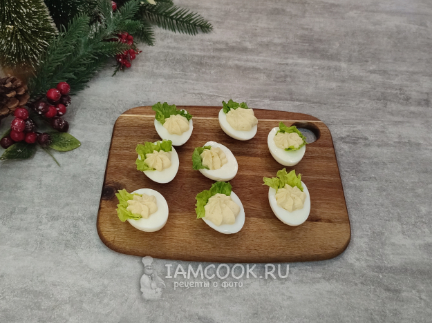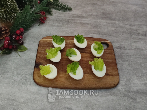 Собираем закуску. В половинки белков выложите по небольшому кусочку салатного листа.