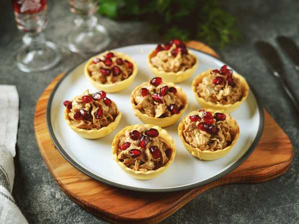 Сверху выложите зерна граната и подавайте тарталетки с курицей и гранатом к столу. Приятного аппетита!