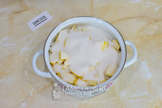 Так нарежьте всю айву. Сверху засыпьте сахаром и оставьте на ночь под крышкой.
