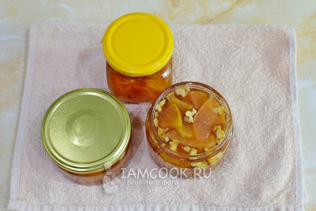 Простерилизуйте чистые баночки любым удобным способом. Крышки обдайте кипятком. Готовое варенье из айвы с грецкими орехами разложите в подготовленные баночки и закройте крышками. Оберните баночки в теплое одеяло и так остудите.
