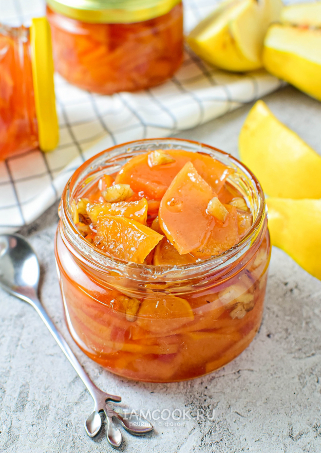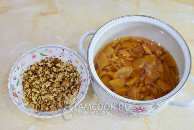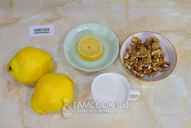 Чтобы приготовить варенье из айвы с грецкими орехами, соберите необходимые ингредиенты по списку. Пропорции можно немного поменять. В зависимости от сладости айвы количество сахара также можно немного изменить.