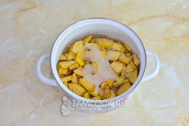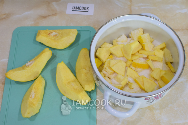 Айву тщательно помойте с мягкой щеткой, чтобы смыть с неё весь пушок. Затем нарежьте айву на ломтики произвольной формы. Складывайте в кастрюлю и пересыпайте сахаром.