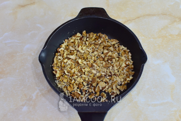 Грецкие орехи порубите ножом и обжарьте до появления характерного аромата.