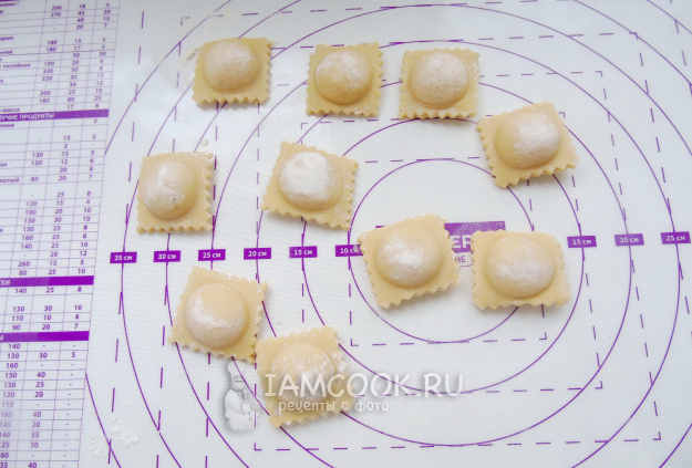 Один пласт разложите на форме для равиоли, предварительно посыпанную мукой.