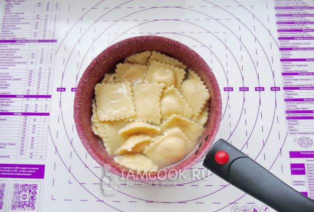 Сварите равиоли. В кастрюле подсоленную воду доведите до кипения и выложите равиоли. Аккуратно перемешайте, чтобы они не прилипли ко дну. Варите их 5-6 минут после того, как равиоли всплывут.