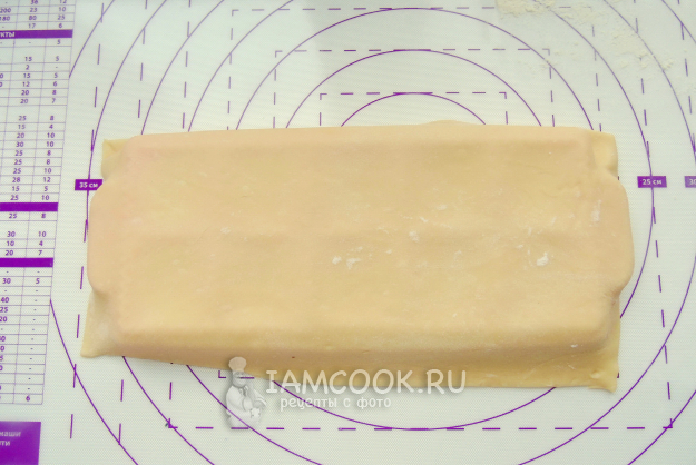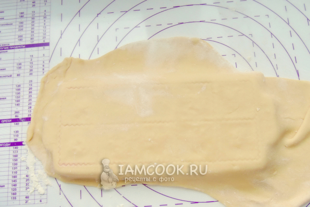 Накройте вторым пластом. Прилагая усилия, пройдитесь скалкой несколько раз по форме.