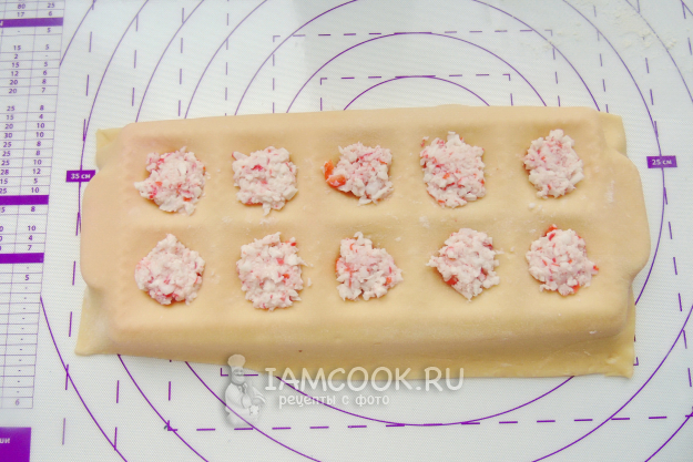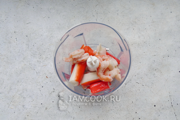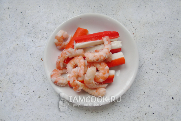 А пока тесто отдыхает, займитесь начинкой. Креветки залейте кипятком и дайте постоять 10 минут. После промойте в воде. Очистите от панциря, головы и кишечной вены. Крабовые палочки освободите от пленок.