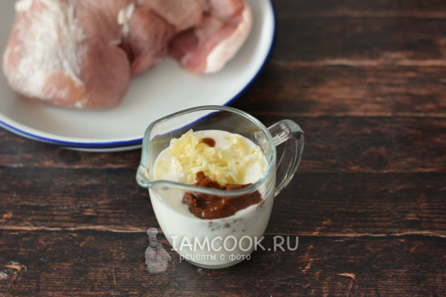 Для этого в йогурт добавьте измельчённый на мелкой тёрке чеснок, аджику и немного соли. С солью будьте внимательны, так как грузинская аджика обычно очень солёная.