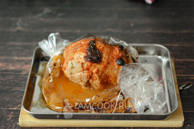 Отрежьте необходимый по длине кусок от рукава для запекания. Завяжите один конец. Положите в рукав замаринованную свинину и вылейте туда же весь маринад. Затем завяжите другой конец рукава для запекания и положите рукав на противень.
