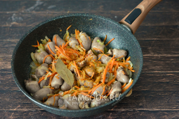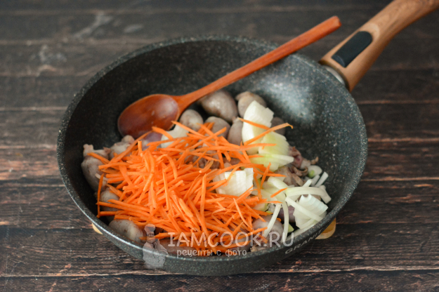 К обжаренным утиным сердечкам добавьте нарезанные соломкой лук и морковь и обжарьте их вместе ещё 5-8 минут, помешивая лопаточкой.