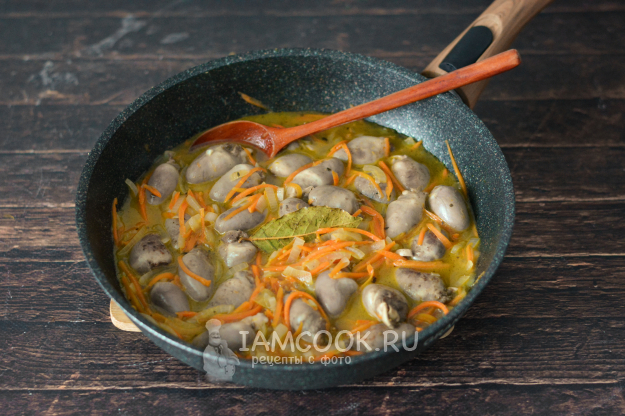 Влейте немного воды, накройте сковороду крышкой и убавьте нагрев плиты. Тушите утиные сердечки на сковороде до мягкости, примерно 30-35 минут.