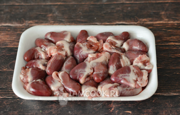 Затем ополосните сердечки под водой и при желании удалите всё, что вас смущает. Меня ничего не смущает, я не срезаю с сердечек жир, а оставляю их в первозданном виде.