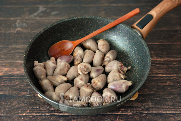 Разогрейте на самом максимальном огне сковороду. Выложите в сковороду сердечки и обжарьте их слегка, 5-8 минут. Я не добавляю в сковороду масло, а обжариваю сердечки на собственном жиру. Как видите, при обжарке жир вытапливается и сердечки приобретают вполне эстетичный вид.
