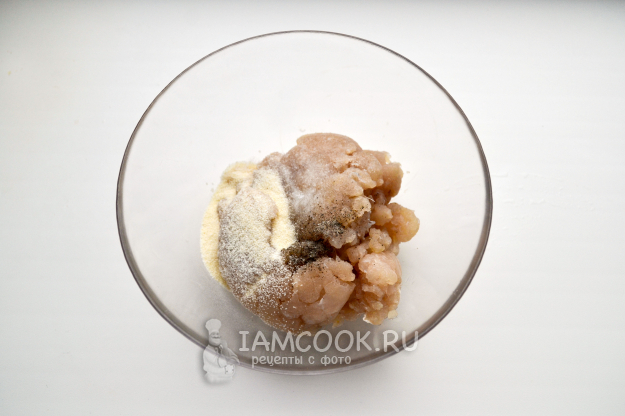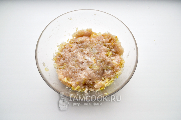 Положите в миску щучий фарш, всыпьте манную крупу, соль и черный молотый перец. Перемешайте.