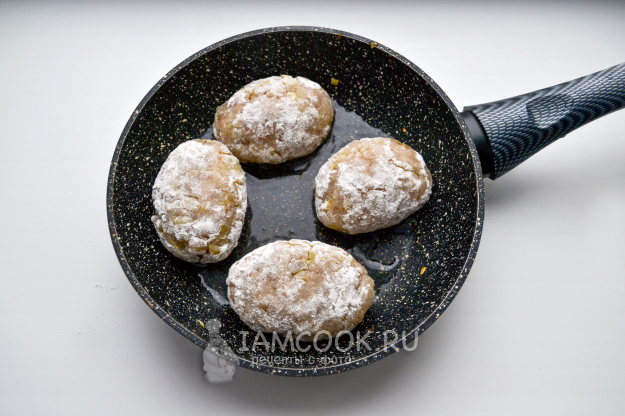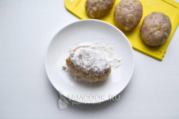 Обкатайте котлеты со всех сторон в муке, излишки муки перед жаркой стряхните.