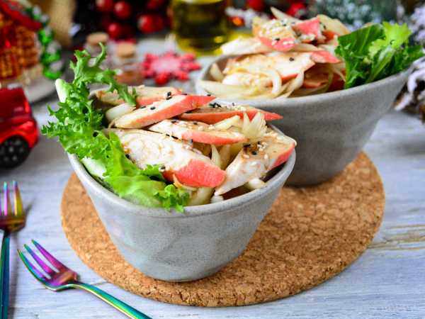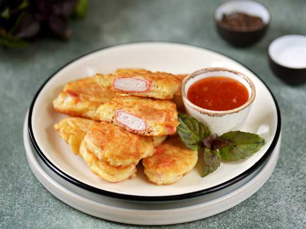 А пока приготовьте начинку. Смешайте крем-сыр с мелко нарезанными крабовыми палочками.