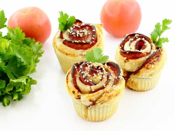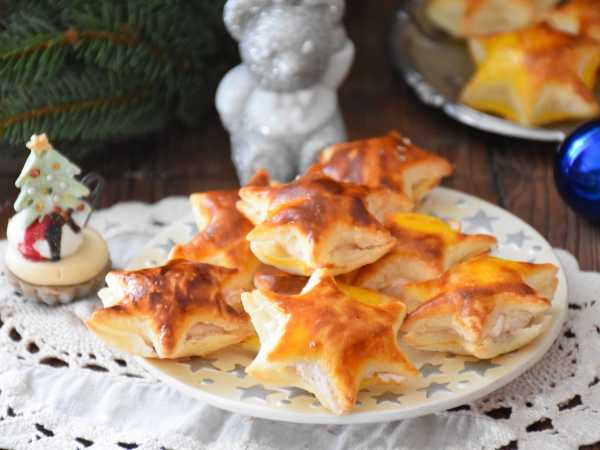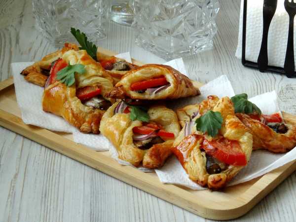 Слоеное тесто нарежьте прямоугольниками размером примерно 7х4 см. Заготовки не раскатывайте.